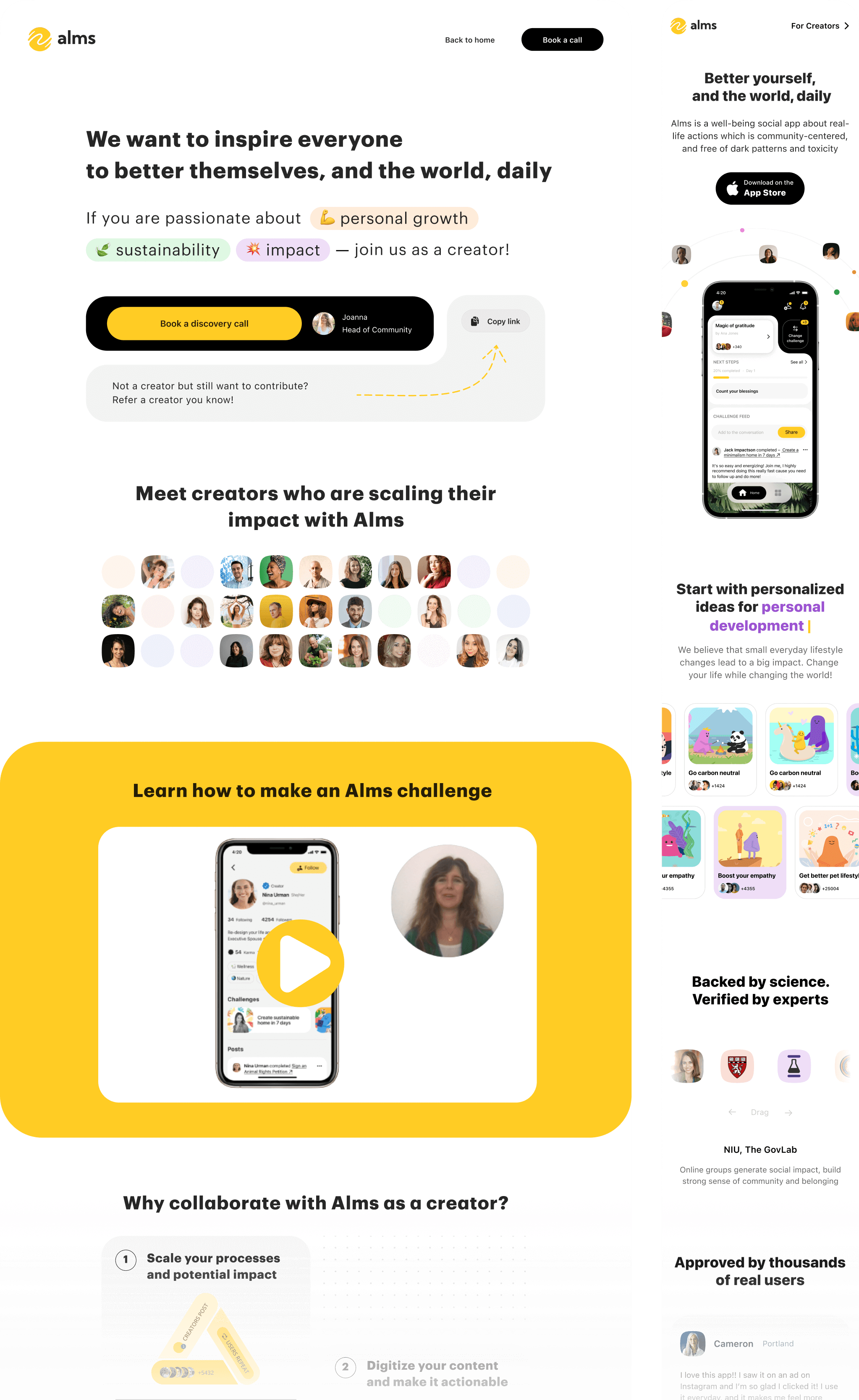 Alms was a well-being app built on a simple idea: doing good in real life should feel small, doable, and rewarding. The shape changed – from personal challenges to social network to creator-led – but the core stayed the same: help people do good and feel better.