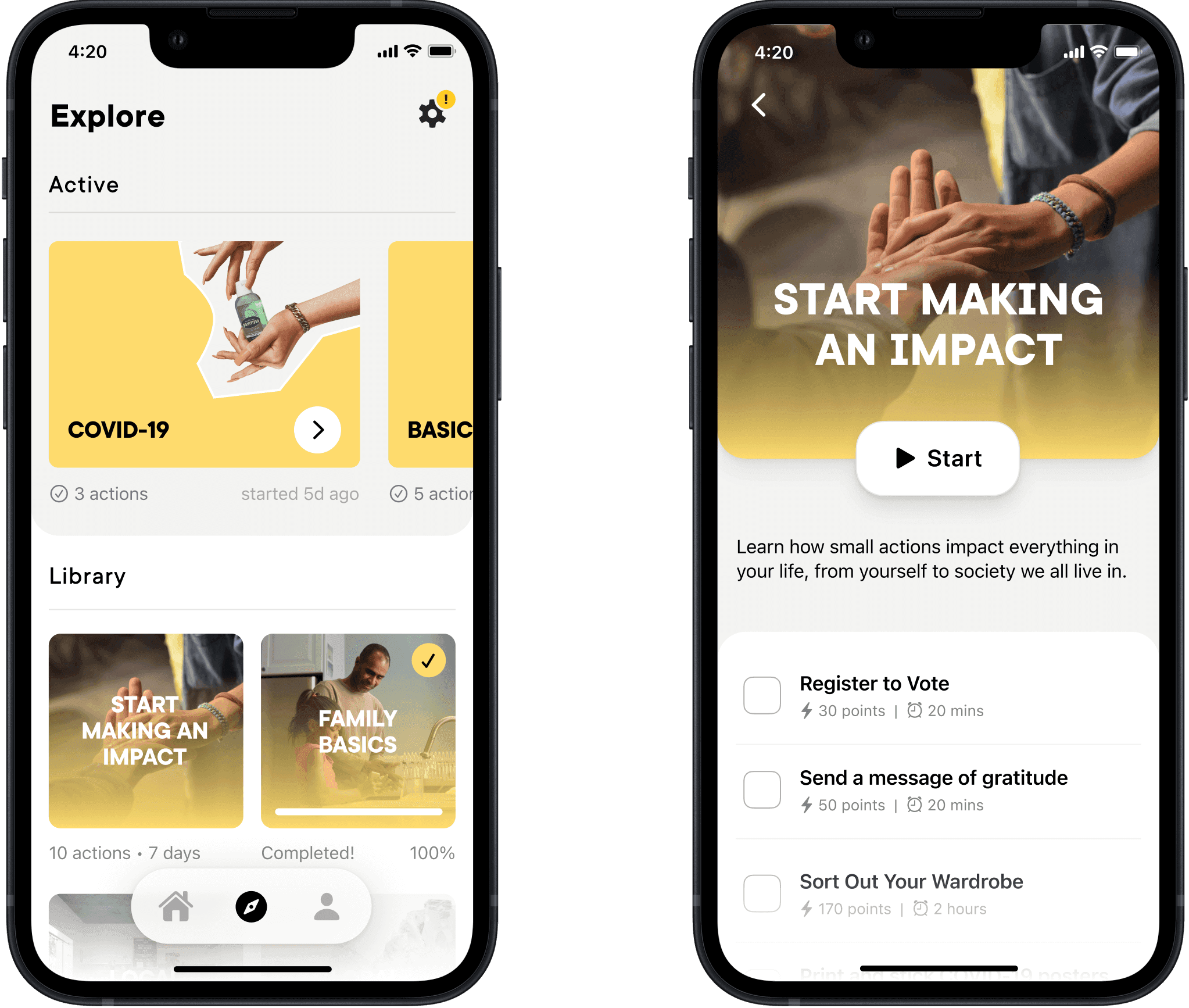 Early testing caught problems. The custom font had readability and licensing issues. Horizontal carousels hid content. Most critically, people couldn't tell single actions from challenge packs. To address this, I switched to system font, moved UI to vertical scroll, and used clearer containers and copy to distinguish actions from packs.