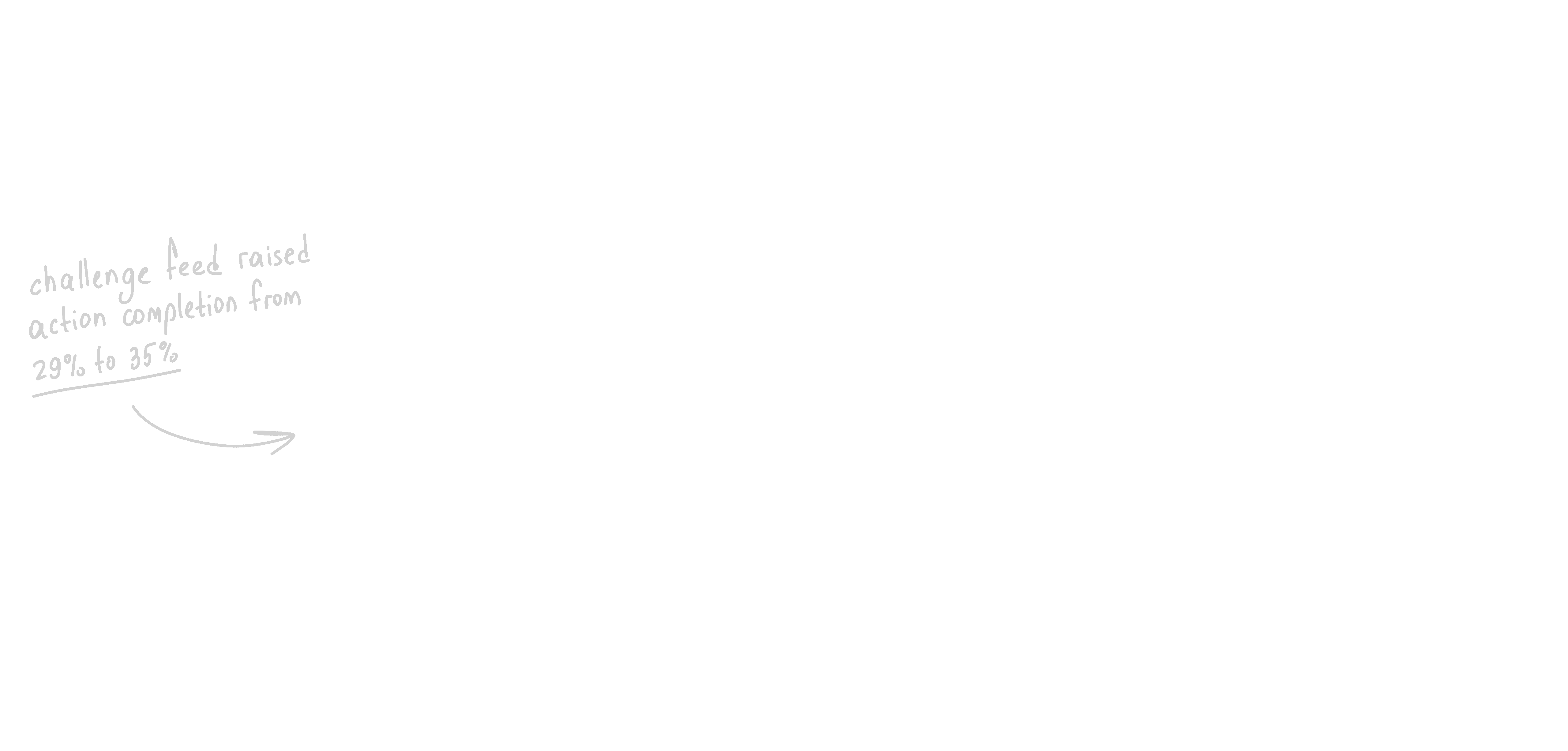 While preparing the V3 pitch, we tested ideas early. One change: challenge-specific sub-feeds instead of one mixed feed. This moved first-action completion from 29% to 35%. Small lift, but it proved the principle – better challenge structure could make this bet work.