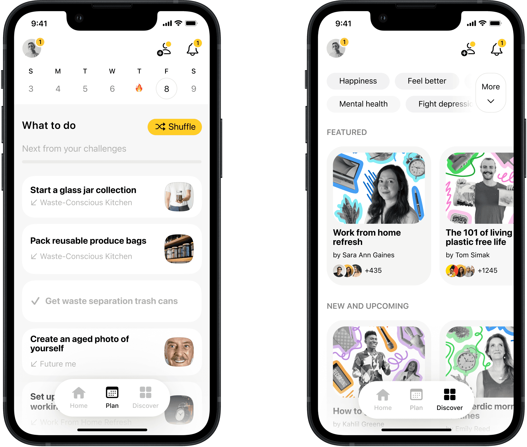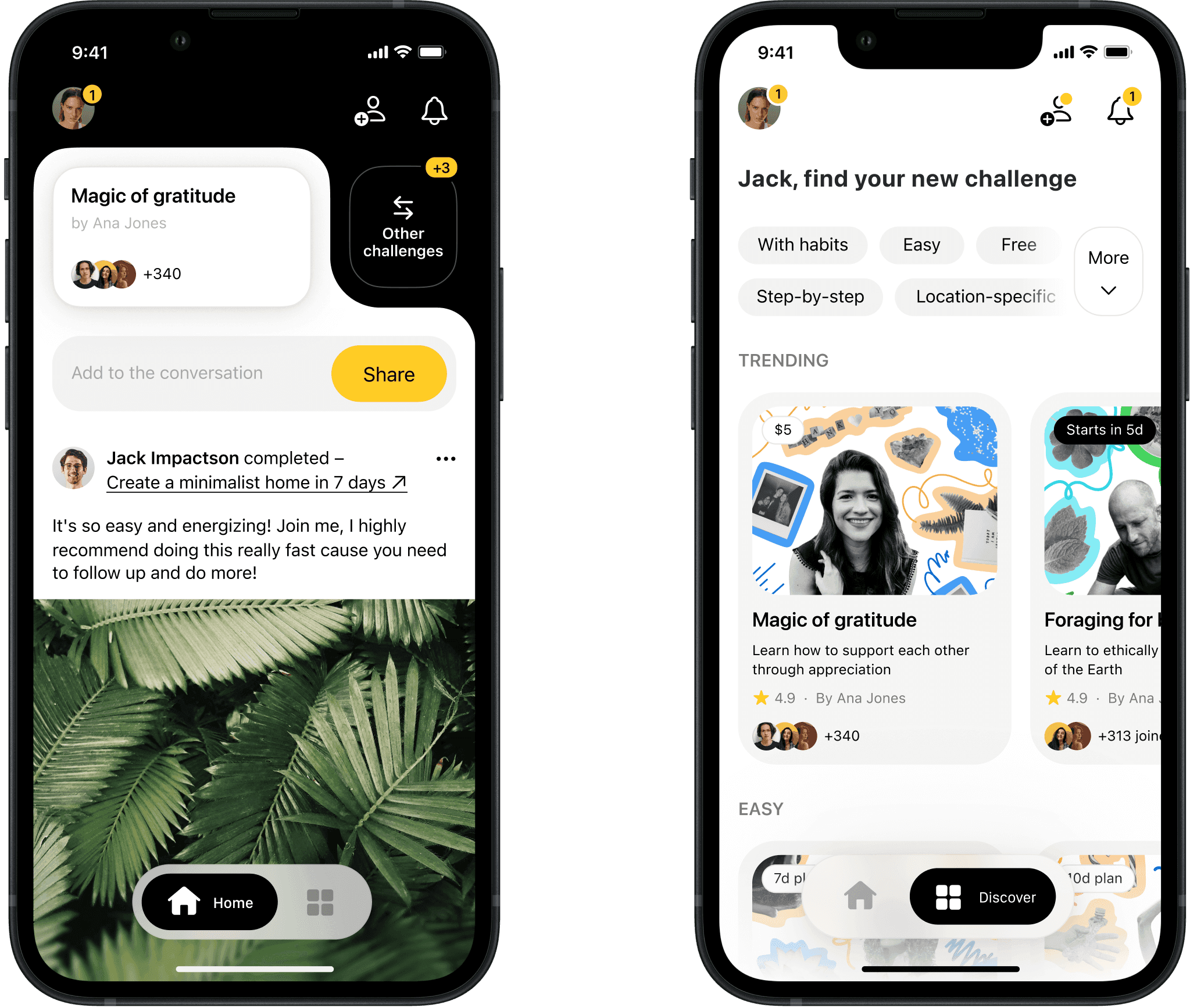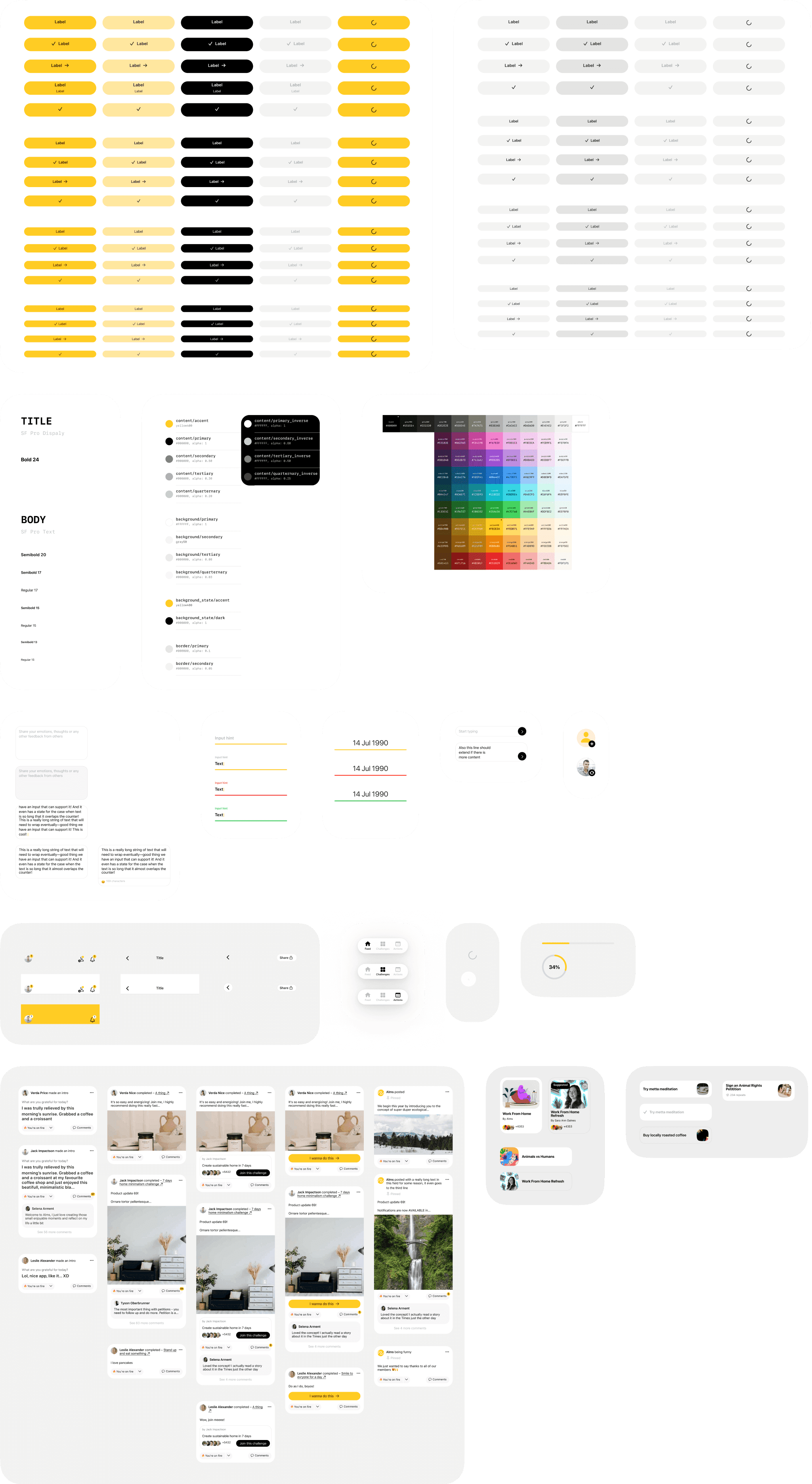 We started broad – a platform mixing habits, challenges, donations, and social features. After a competitive scan, I defined the brand basics: progressive yet accessible layout, restrained palette with optimistic yellow accents, realistic visuals, and an informal but safe voice.
