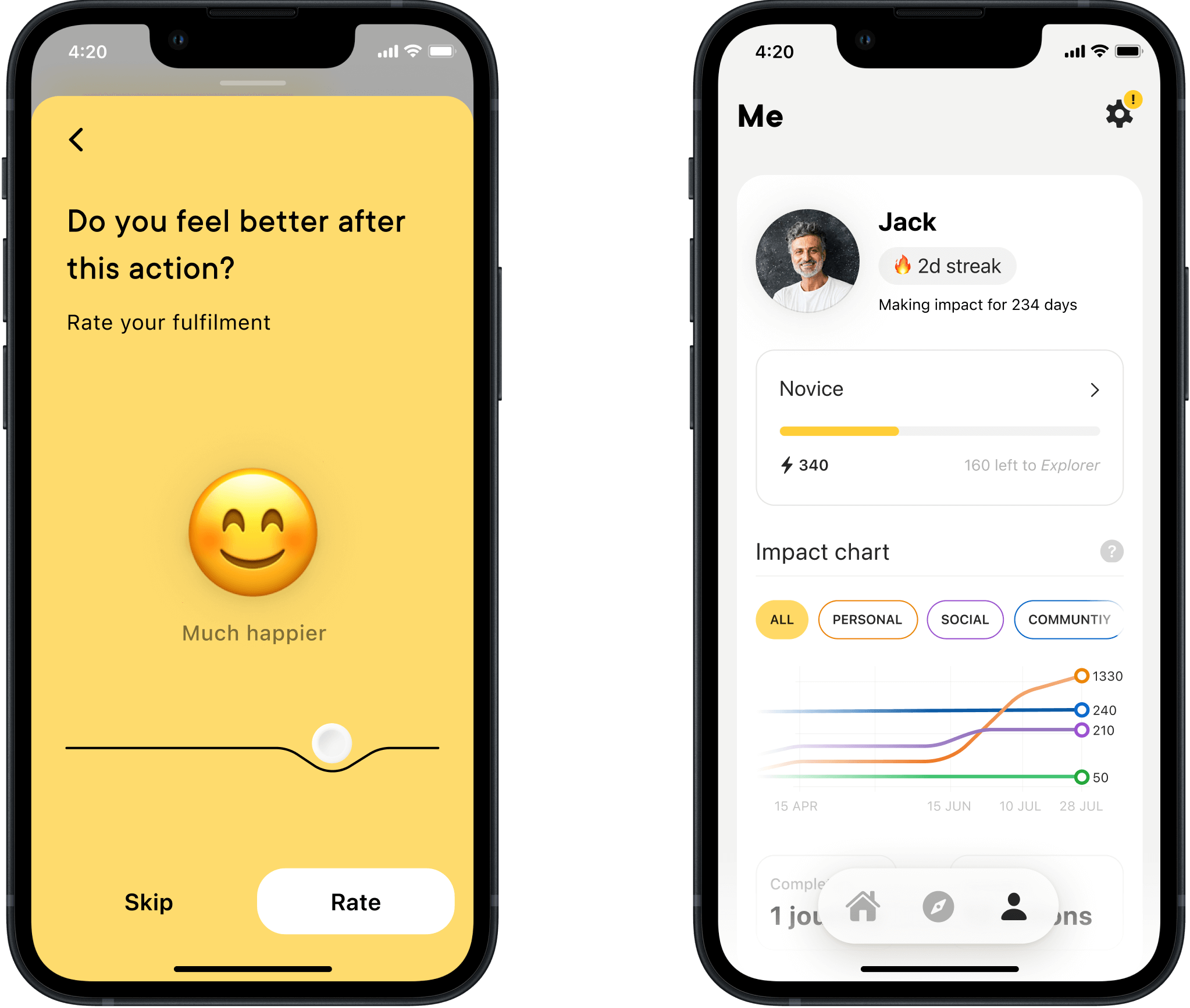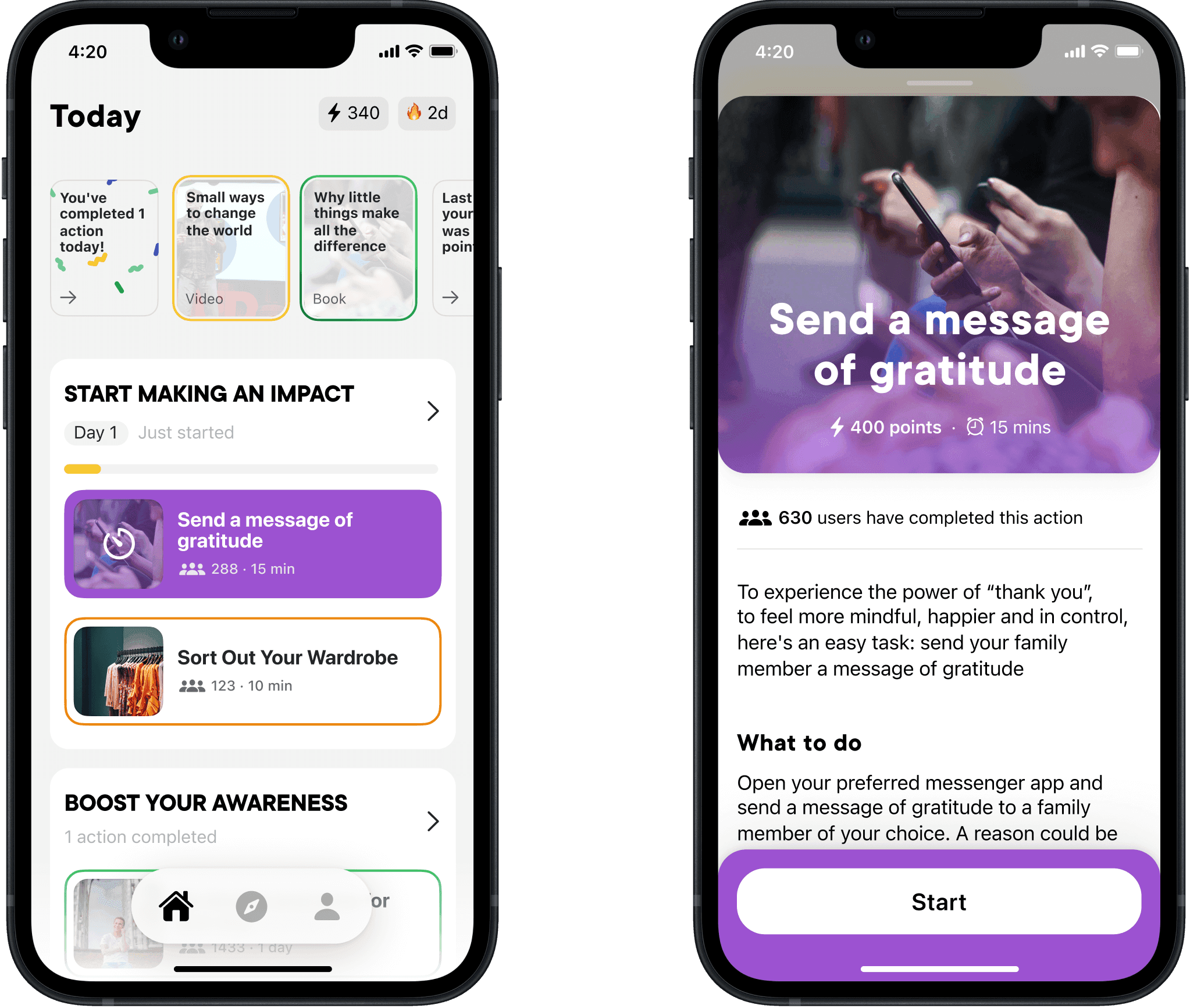 We wanted to prove that doing good regularly makes you feel better, and that sharing those moments could nudge others to try. The hard part? We ask for effort offline. That's a lot of friction. The challenge was lowering the first-step barrier, making progress visible, and keeping the experience calm rather than noisy or preachy.