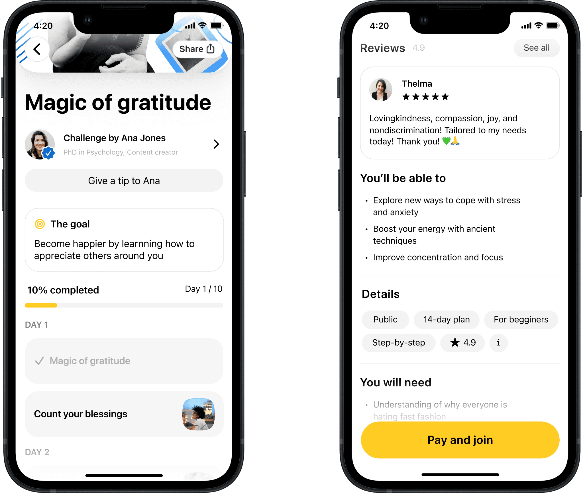 We looked at what course platforms offered that we didn't. Key ideas: preview with reviews, clear day-by-day structure, creator profiles with tipping, progress tracking, and richer formats like video and stories. All broken into quick steps around small wins. We prototyped with creators to test what resonated.